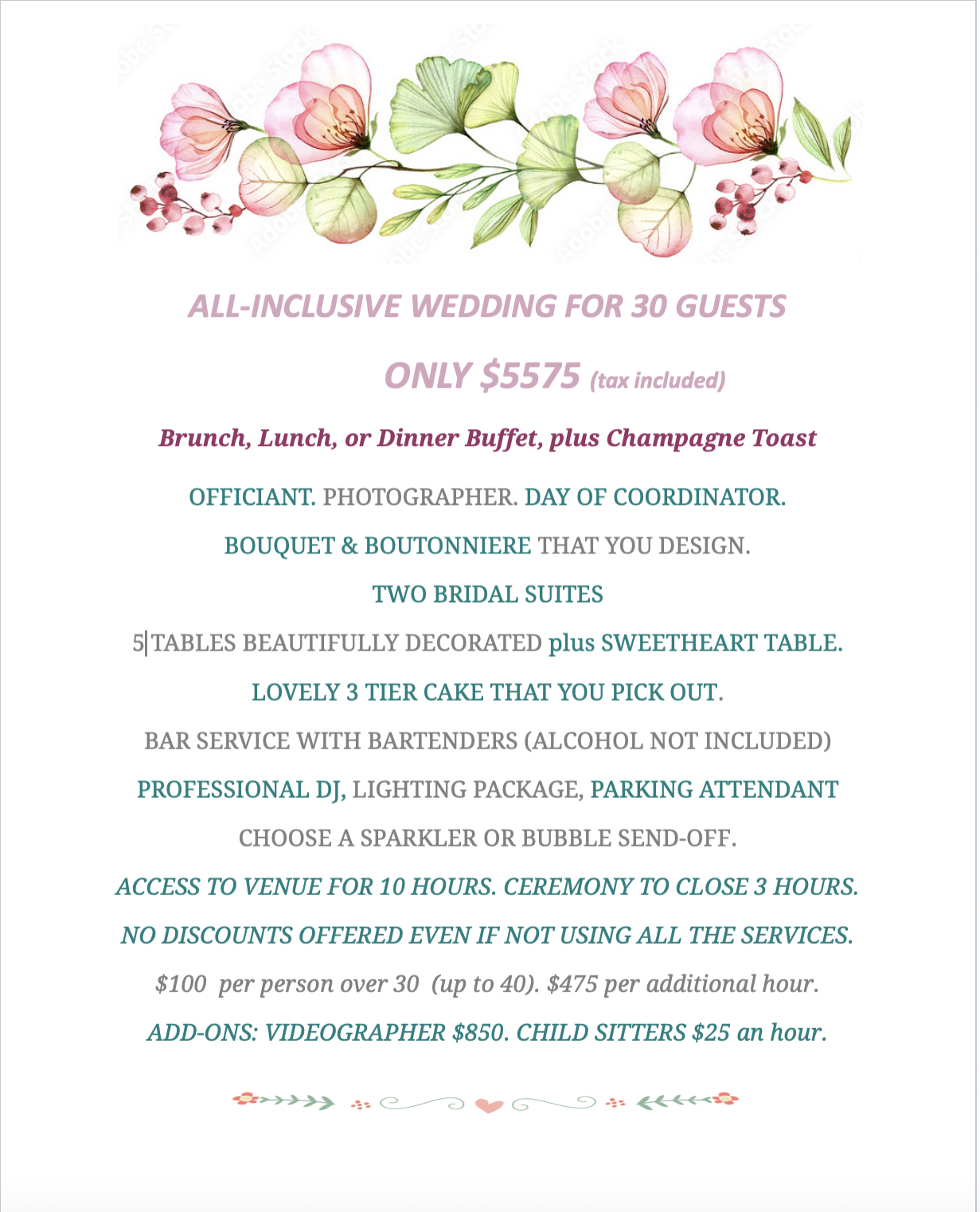 Micro Weddings are hosted Sunday thru Friday. A Saturday will incur an additional $1250.